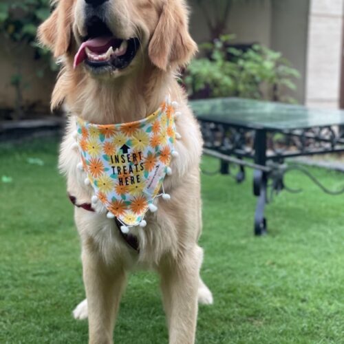 Look cute with this stylish blue bandana with white daisies! Made with cotton, featuring vinyl text & white pom pom