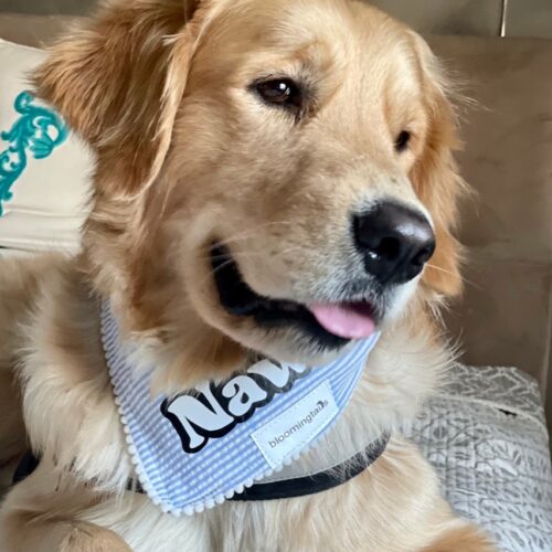 A pale pink bandana with LOVE printed all over is so soft and a staple for your pup’s wardrobe. Customise it