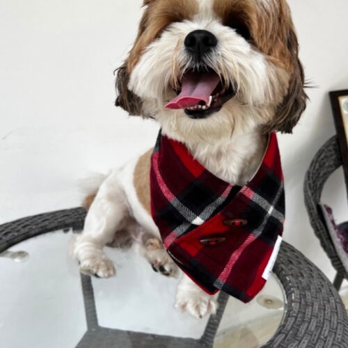 Sant paws features a red & black plaid flannel dog muffler. Perfect for chilly strolls and a must-have fashion accessory,